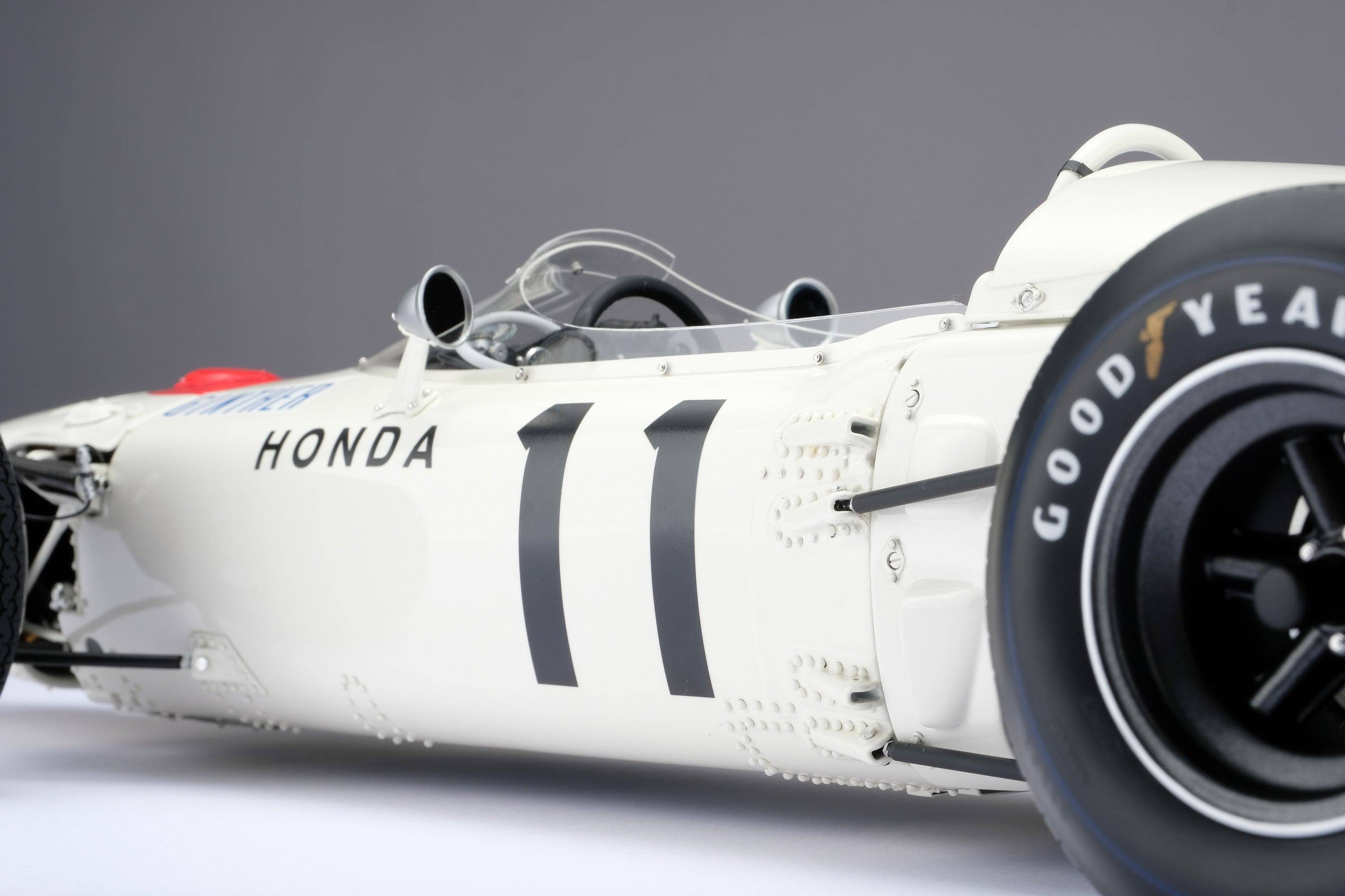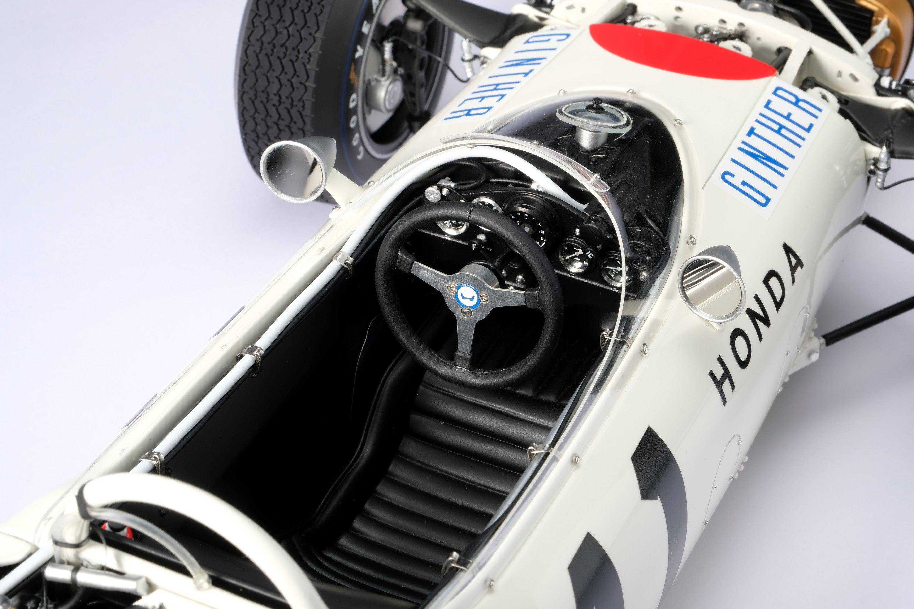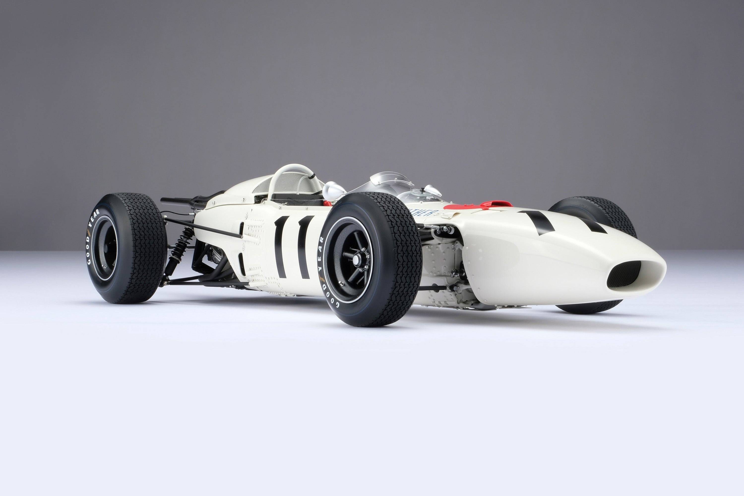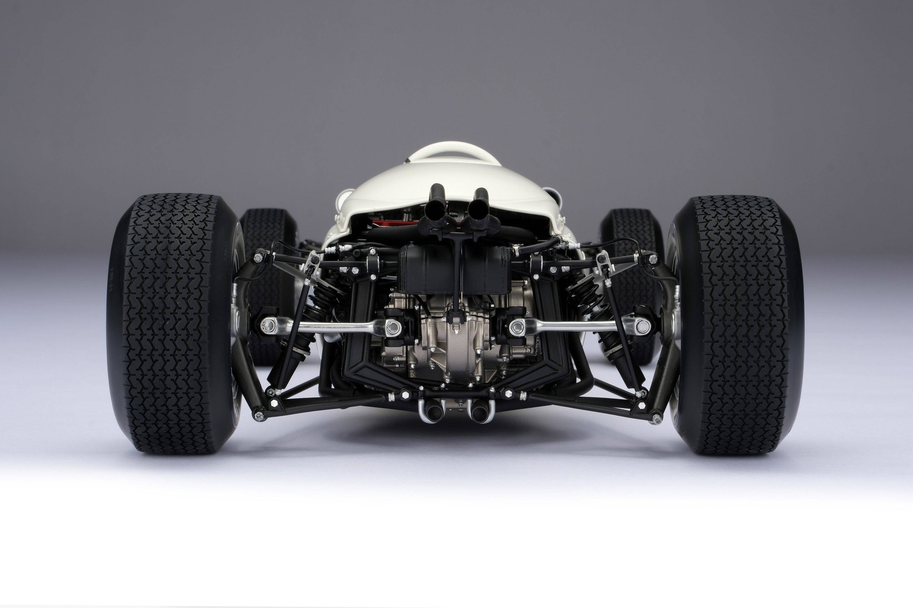 這款精美的1:8比例本田RA272模型,完美復刻了里奇·金特(Richie Ginter)在1965年10月24日於海拔極高的馬格達萊納·米克斯胡卡體育城(Ciudad Deportiva Magdalena Mixhuca)舉行的第四屆墨西哥大獎賽上奪冠的賽車。賽前,車隊在整個賽季中都展現出了不俗的速度,但卻飽受可靠性和重量問題的困擾。然而,海拔2200公尺的稀薄空氣卻完美地發揮了本田燃油噴射V12引擎的優勢,使其在競爭對手引擎動力下降的情況下依然保持了強勁的性能。