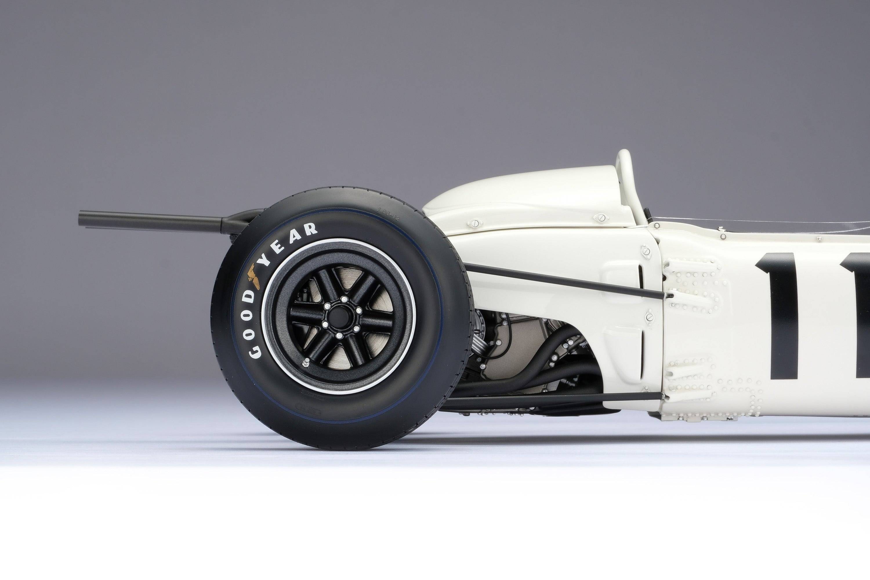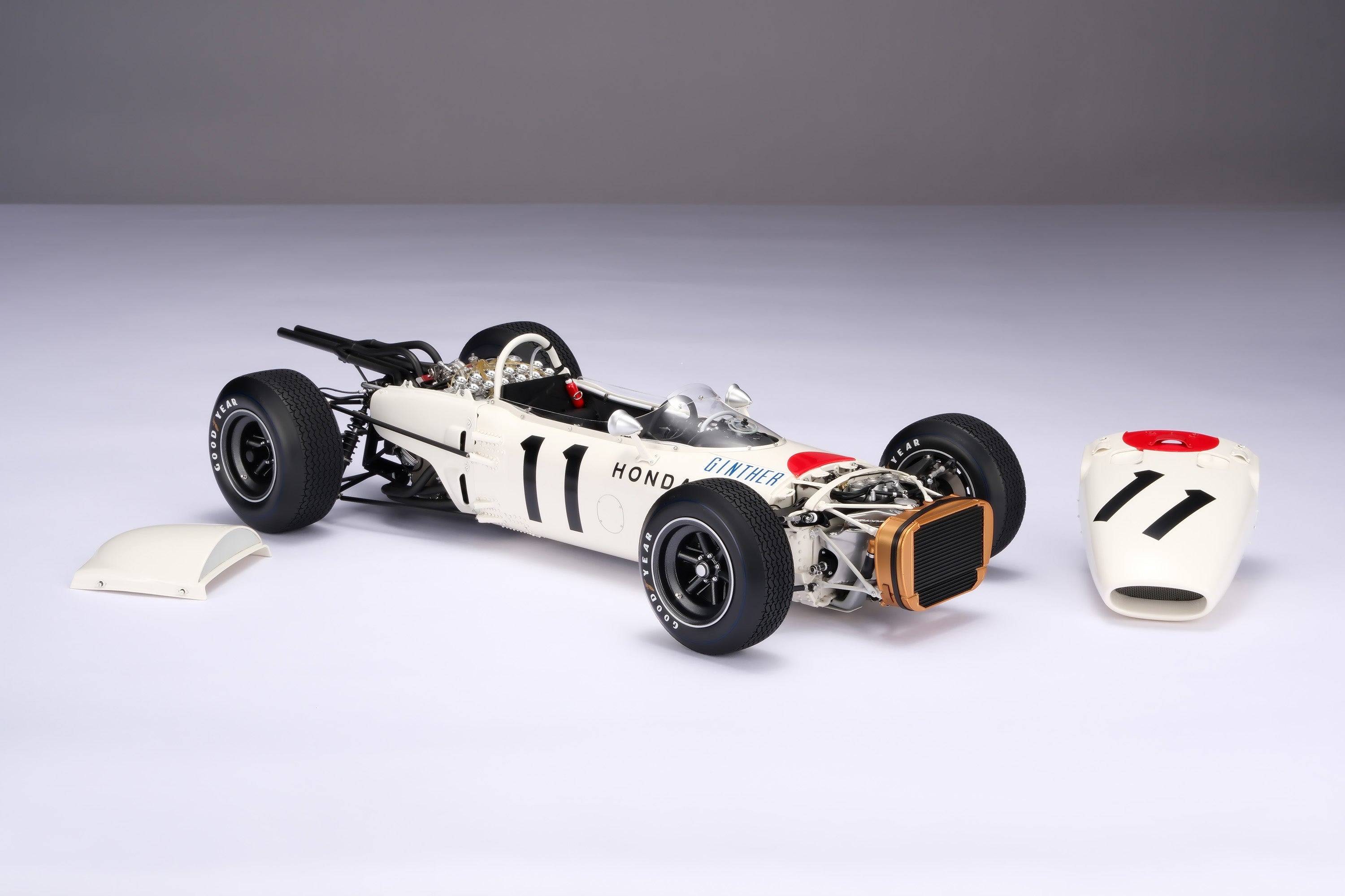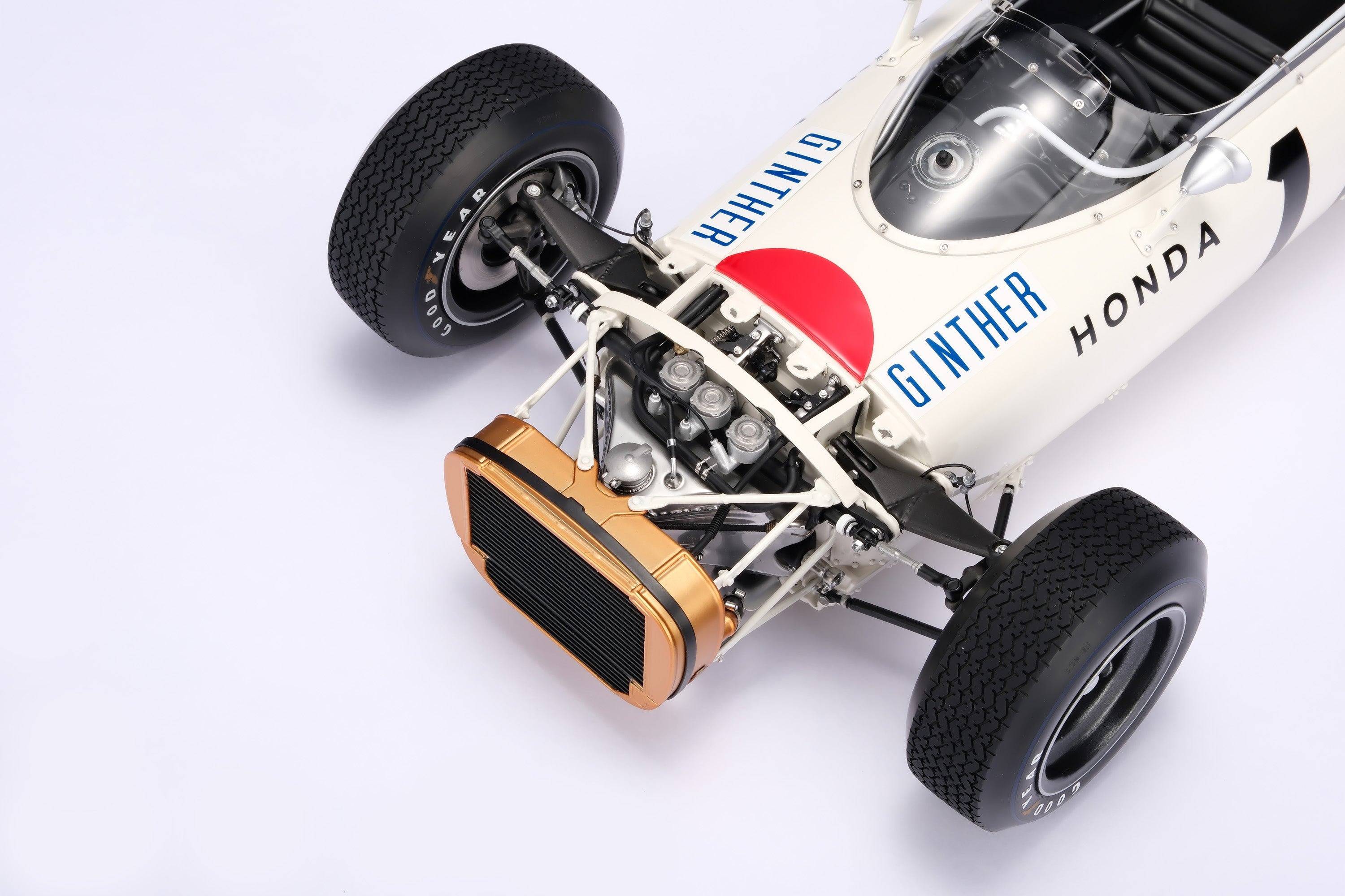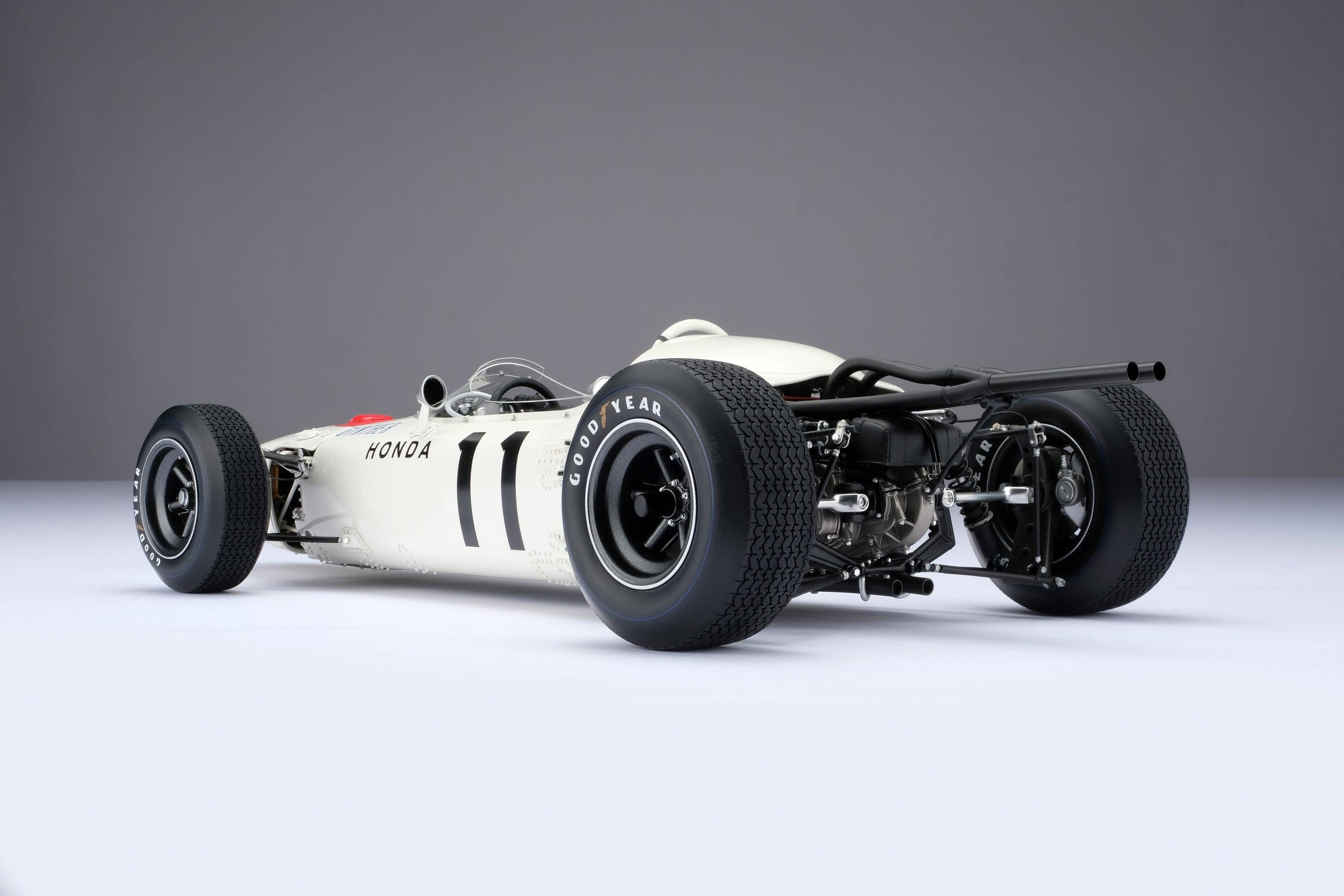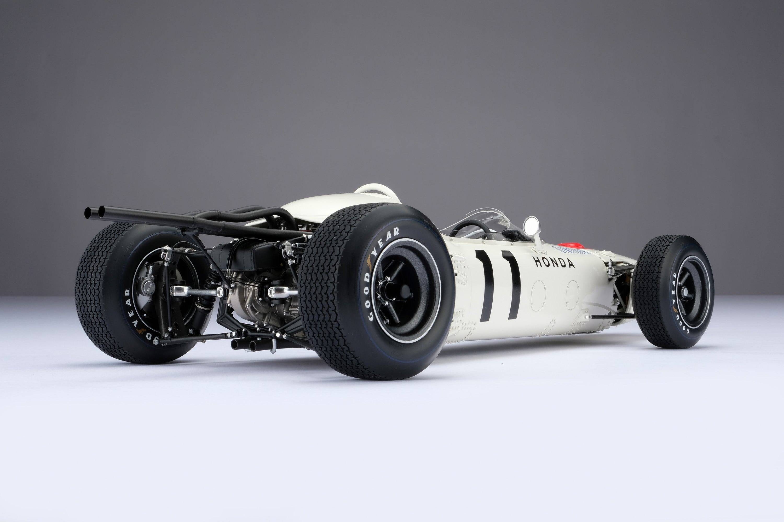 這款精美的1:8比例本田RA272模型,完美復刻了里奇·金特(Richie Ginter)在1965年10月24日於海拔極高的馬格達萊納·米克斯胡卡體育城(Ciudad Deportiva Magdalena Mixhuca)舉行的第四屆墨西哥大獎賽上奪冠的賽車。賽前,車隊在整個賽季中都展現出了不俗的速度,但卻飽受可靠性和重量問題的困擾。然而,海拔2200公尺的稀薄空氣卻完美地發揮了本田燃油噴射V12引擎的優勢,使其在競爭對手引擎動力下降的情況下依然保持了強勁的性能。