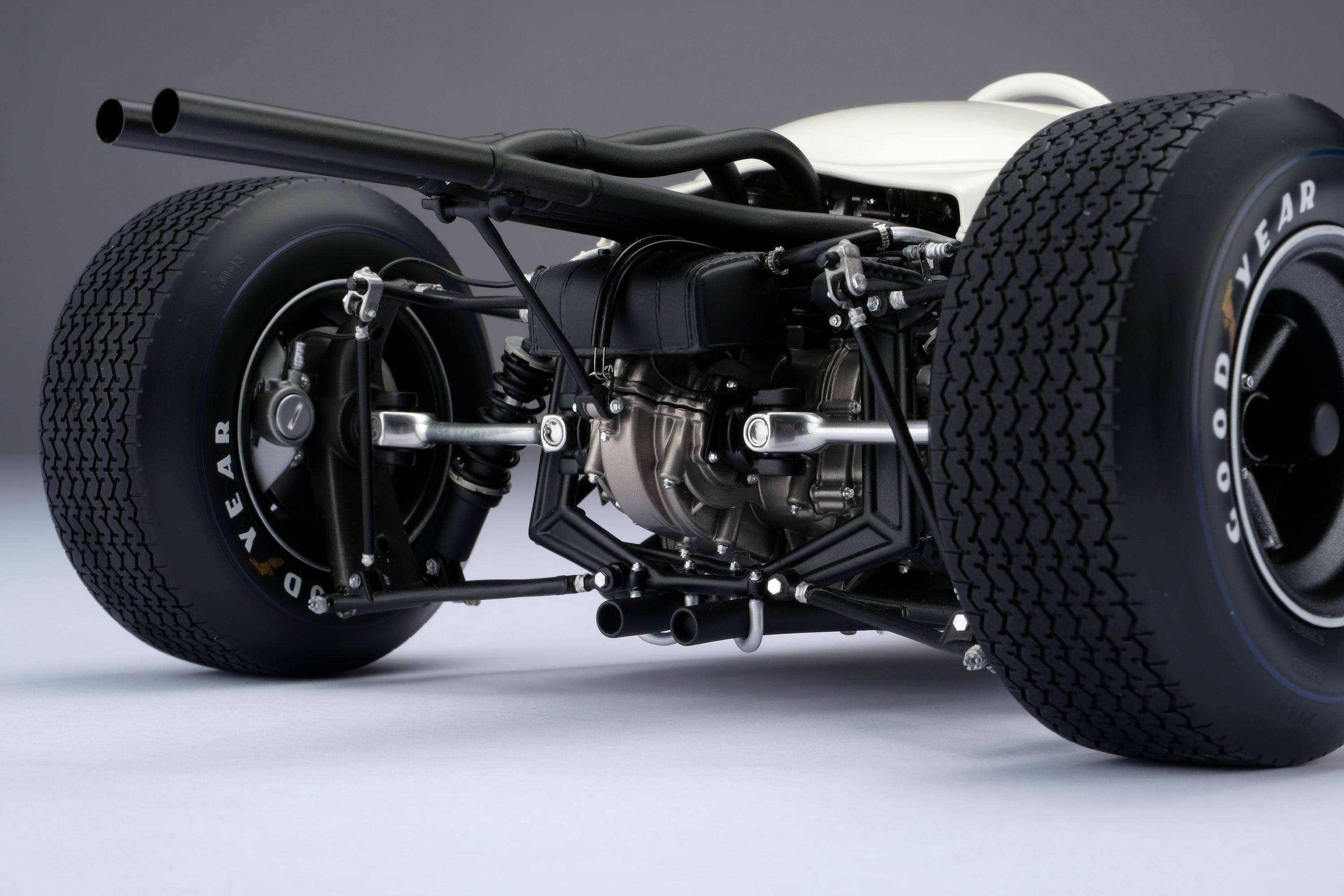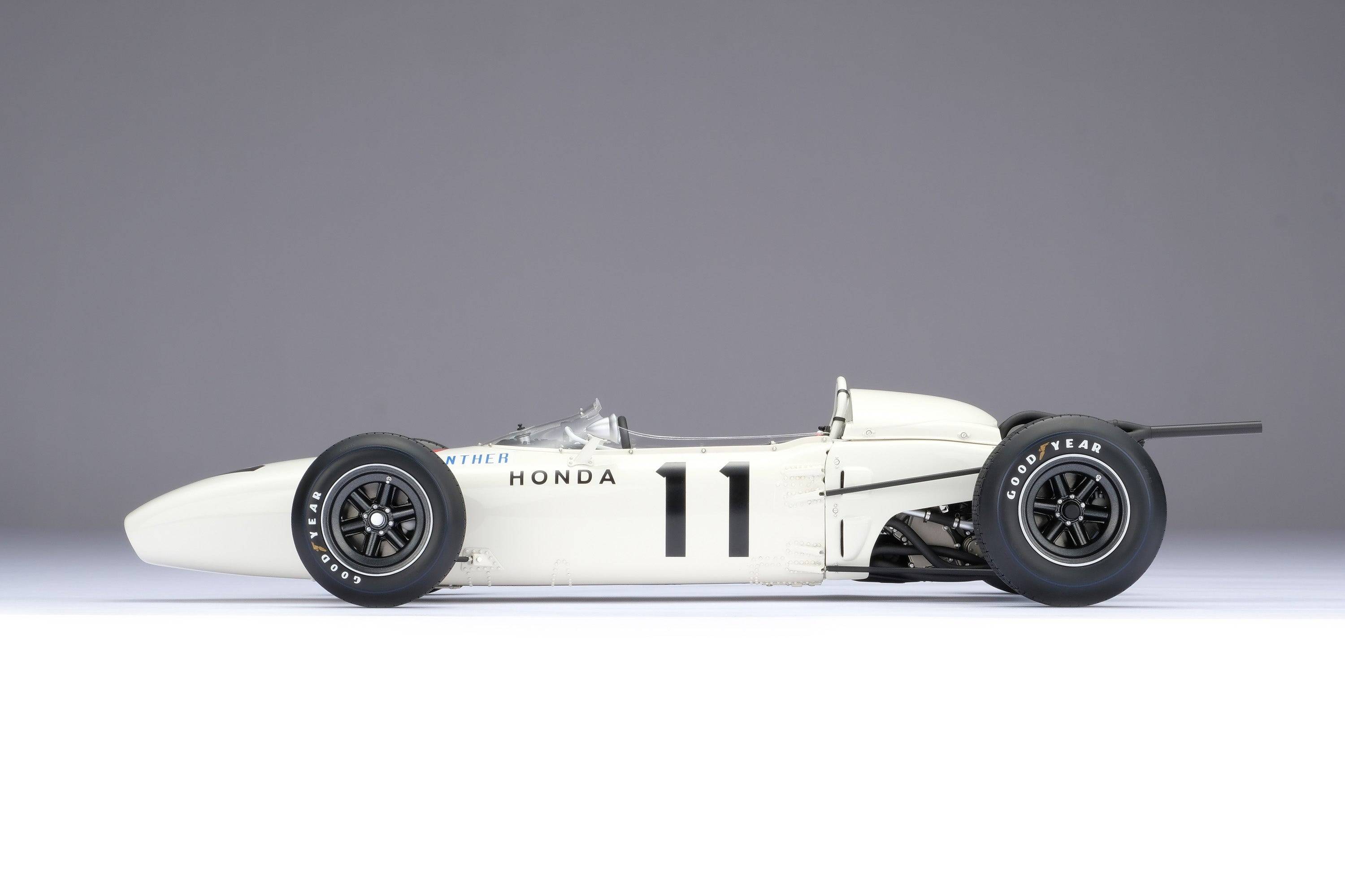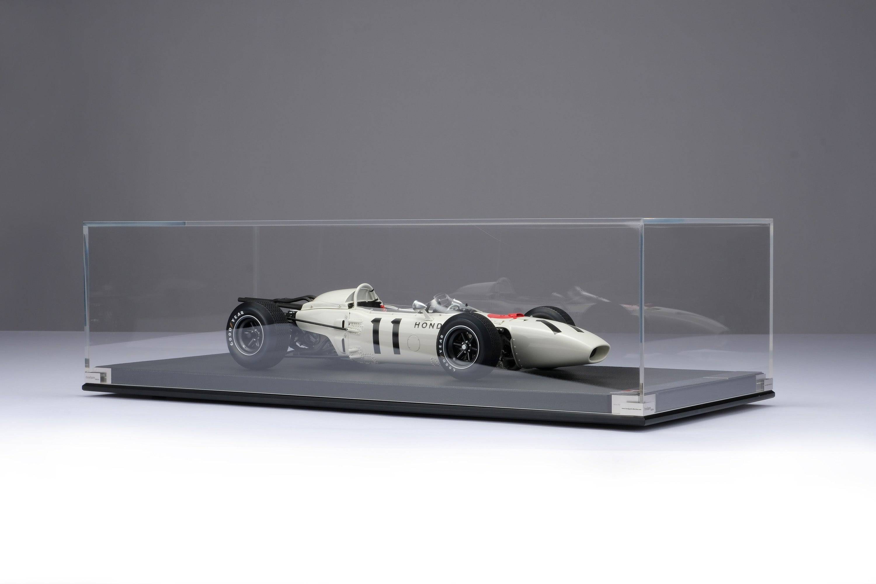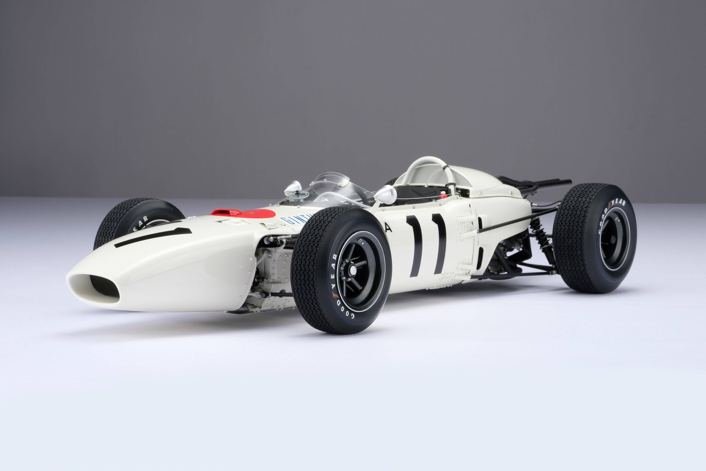 這款精美的1:8比例本田RA272模型,完美復刻了里奇·金特(Richie Ginter)在1965年10月24日於海拔極高的馬格達萊納·米克斯胡卡體育城(Ciudad Deportiva Magdalena Mixhuca)舉行的第四屆墨西哥大獎賽上奪冠的賽車。賽前,車隊在整個賽季中都展現出了不俗的速度,但卻飽受可靠性和重量問題的困擾。然而,海拔2200公尺的稀薄空氣卻完美地發揮了本田燃油噴射V12引擎的優勢,使其在競爭對手引擎動力下降的情況下依然保持了強勁的性能。